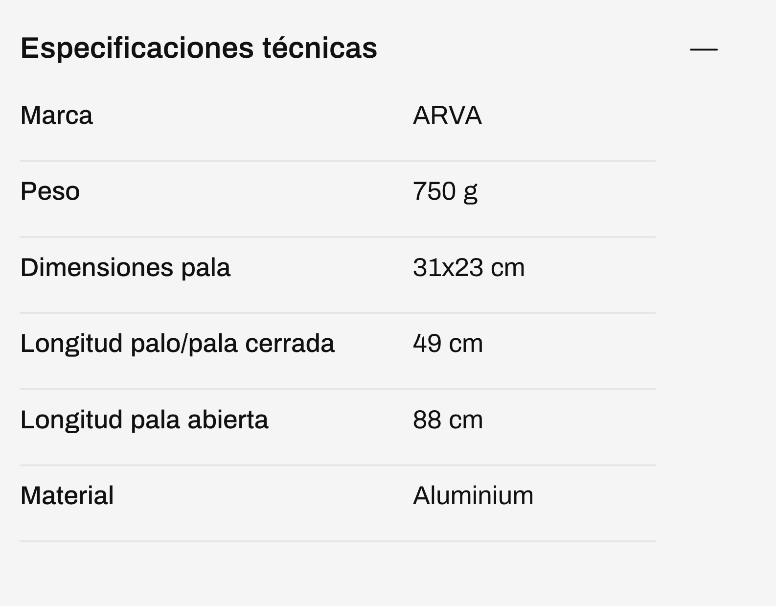 La pala de aluminio reforzado tiene un grosor de 2 mm, 31x23 cm de largo y ancho que le permiten, manteniendo un bajo peso, ser eficaz en todo tipo de nieve. El eje, fabricado en aluminio, tiene un perfil ovalado y un mango en forma de Y, ergonómico y de fácil agarre. Su particularidad es que uno de los lados del mango permite fijar la hoja de la pala convirtiéndola en un hacha. Adelante, la caña está equipada con un mango de goma muy cómodo para usar cuando está en este modo.